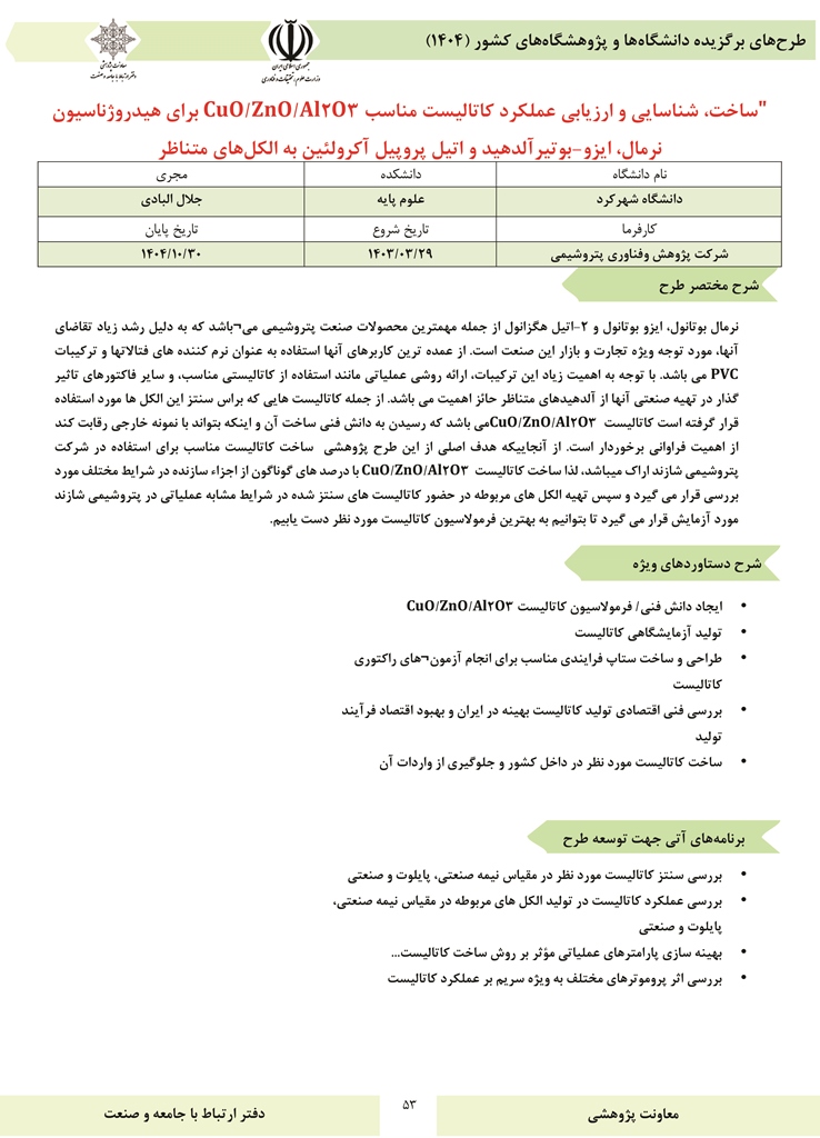 به گزارش روابط عمومی دانشگاه شهرکرد، طرح دکتر جلال البادی عضو هیات علمی دانشکده علوم پایه دانشگاه شهرکرد با عنوان "ساخت، شناسایی و ارزیابی عملکرد کاتالیست مناسب CUO/ZNO/AL2O3 برای هیدروژناسیون نرمال، ایزو-بوتیرآلدهید و اتیل پروپیل آکرولئین به الکل‌های متناظر" به عنوان یکی از طرح‌های برگزیده دانشگاه‌ها و پژوهشگاه‌های کشور 1404 انتخاب شد.