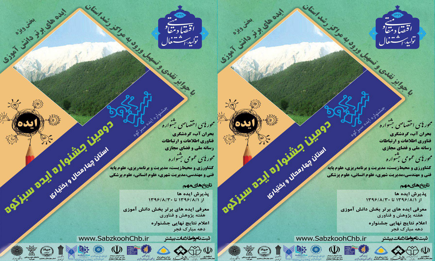 دومین جشنواره ایده سبزکوه استان چهارمحال و بختیاری با جوایز ویژه و تسهیل در ورود به مراکز رشد استان علاقه مندان می توانند ایده ها و طرحهای فناورانه خود را به نشانی www.sabzkoohchb.ir ارسال نمایند.