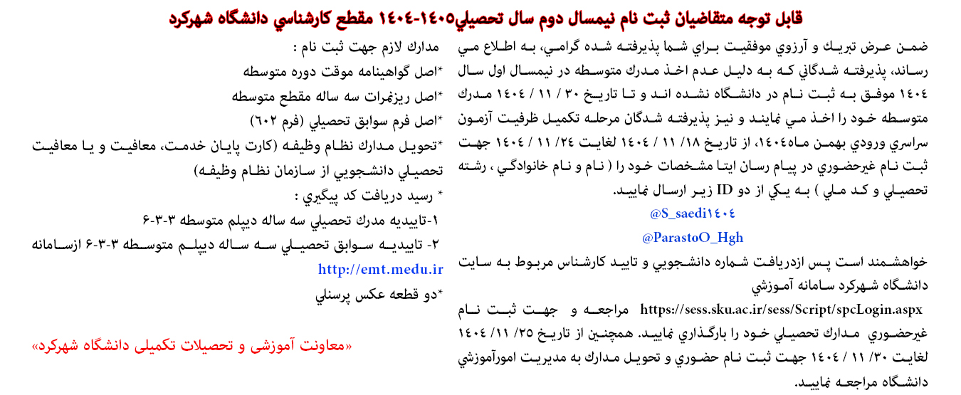 «اطلاعیه شماره ۲ ثبت نام پذیرفتهشدگان دوره کارشناسی و دکترای عمومی (دامپزشکی) سال تحصیلی ۱۴۰5-1404 دانشگاه شهرکرد»
