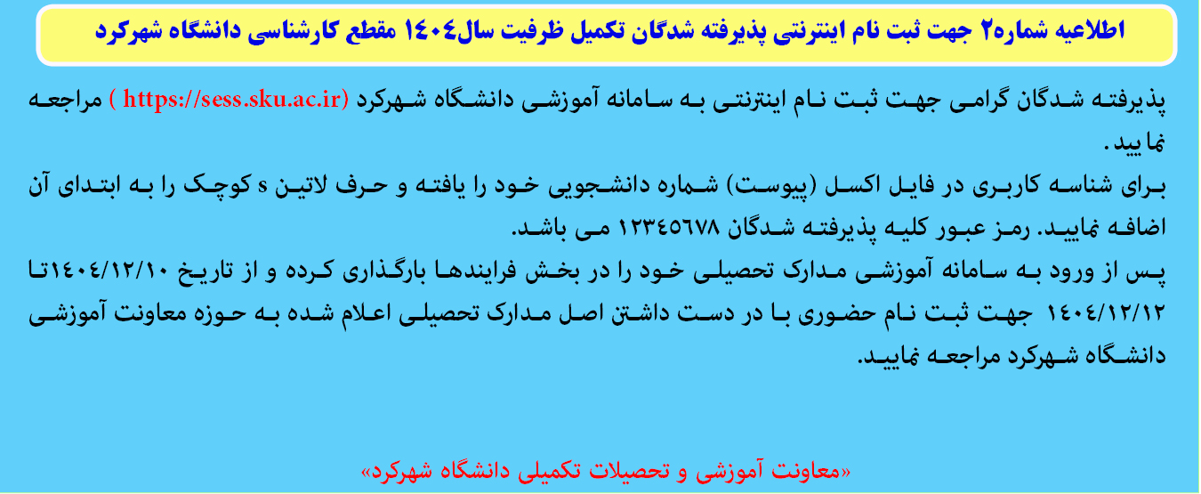 قابل توجه پذیرفته شدگان تکمیل ظرفیت نیمسال دوم سال تحصیلی ۱۴۰۵-۱۴۰۴ مقطع کارشناسی دانشگاه شهرکرد