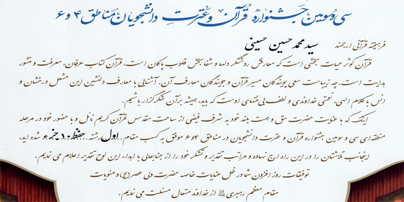 به گزارش روابط عمومی دانشگاه شهرکرد، سید محمدحسین حسینی دانشجوی  مقطع کارشناسی ارشد رشته مهندسی مکانیک - طراحی کاربردی دانشگاه شهرکرد رتبه اول رشته حفظ 10 جزء قرآن کریم را در سی و سومین جشنواره قرآن و عترت دانشجویان مناطق 4 و 6 کشور کسب کرد این مسابقات به میزبانی دانشگاه صنعتی اصفهان 20 و 21 اردیبهشت برگزار شد.