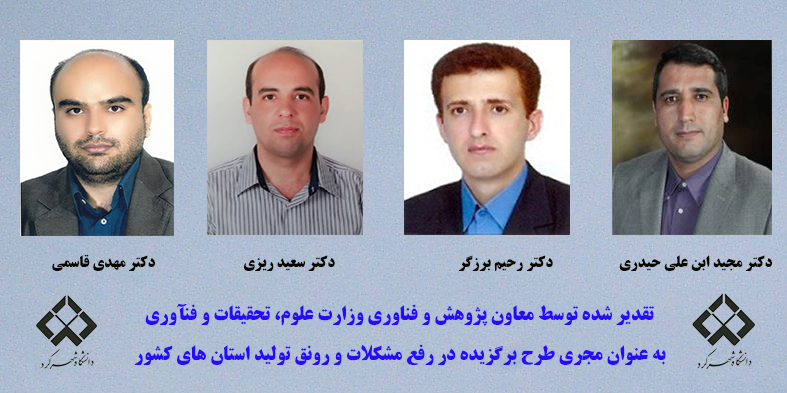 به گزارش روابط عمومی دانشگاه شهرکرد، دکتر مسعود برومند معاون پژوهش و فنآوری وزارت علوم، تحقیقات و فناوری از دکتر مجید ابن علی حیدری عضو هیات علمی دانشکده فنی و مهندسی دانشگاه شهرکرد برای طرح" ارتقاء و بروزرسانی تصفیه خانه مجتمع چم کاکا با بکارگیری سیستم اسکاداد تله متری جهت مدیریت هوشمند تجهیزات و الکترو پمپ ها با دانش بومی ایرانی" و از دکتر رحیم برزگر، دکتر سعید ریزی و دکتر مهدی قاسمی ورنامخواستی سه عضو هیات علمی دانشکده کشاورزی دانشگاه شهرکرد برای طرح" تولید پایه های تجاری از شاخه بریده به روش استنتینگ تحت شرایط نور مصنوعی(LED)" به عنوان مجری طرح برگزیده در رفع مشکلات و رونق تولید استان های کشور تقدیر کرد.