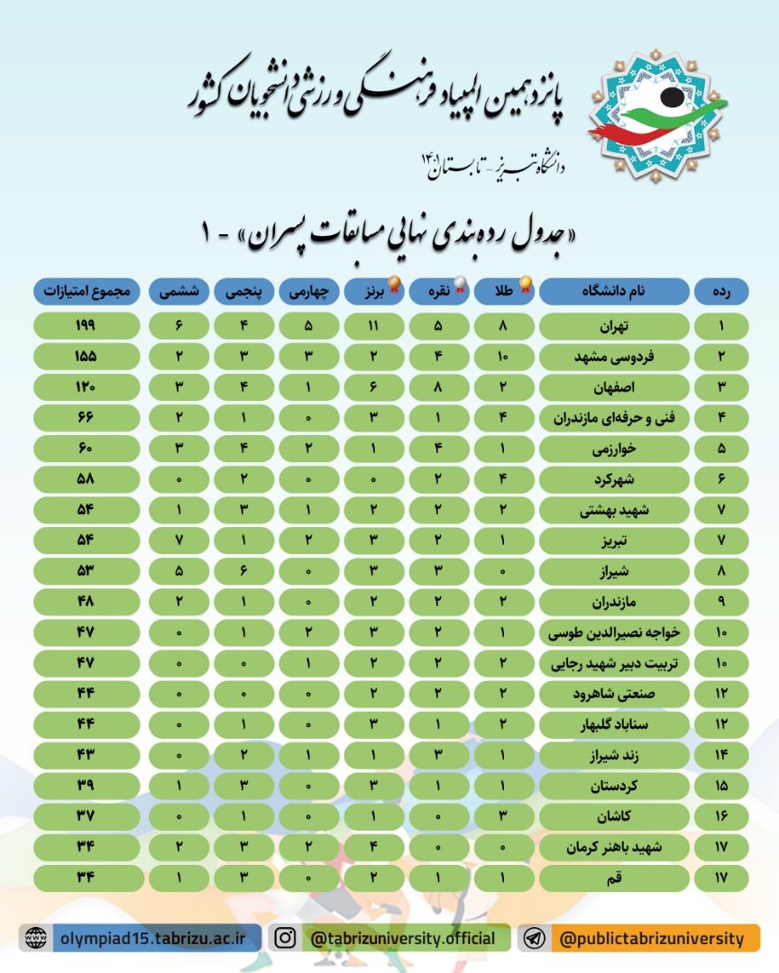 علی رضا نوری درماده800 متر و 1500 متر دوومیدانی به ترتیب مدال طلا و نقره، دانیال صفی شلمزاری در پرتاب دیسک مدال نقره و سعید فتحی در وزن 8 تکواندو مدال طلا برای کاروان ورزشی دانشجویان پسر دانشگاه شهرکرد کسب کردند.