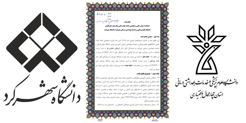 به گزارش روابط عمومی دانشگاه شهرکرد، روز شنبه 7 آبان ماه 1401، تفاهم نامه همکاری دانشگاه شهرکرد و دانشگاه علوم پزشکی شهرکرد با موضوع همکاری علمی، آموزشی، تحقیقاتی و تخصصی اعضای هیات علمی دانشگاه علوم پزشکی و خدمات بهداشتی درمانی شهرکرد بر اساس ماده (114) آیین نامه اداری استخدامی اعضا هیات علمی دانشگاه ها و دانشکده های علوم پزشکی و خدمات بهداشتی درمانی با موسسات دولتی یا نهادهای عمومی یا سازمان های بین المللی در خارج از ساعات موظف و همچنین استفاده متقابل از همکاری علمی، آموزشی، تحقیقاتی و تخصصی اعضای هیات علمی دانشگاه شهرکرد، مسائل و موضوعات مرتبط با امور آموزشی، فرهنگی، تحقیقاتی دانشجویان هر دو دانشگاه و استفاده از امکانات رفاهی و ورزشی داخل و خارج استان هر دو دانشگاه جهت اعضای هیات علمی به امضای دکتر یاسر پیرعلی رییس دانشگاه شهرکرد و دکتر ارسلان خالدی فررییس دانشگاه علوم پزشکی شهرکرد رسید.